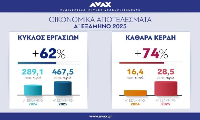 Στα υψηλότερα επίπεδα της ιστορίας του διαμορφώνονται τα οικονομικά μεγέθη για τον Όμιλο ΑΒΑΞ το Α’ εξάμηνο του 2025, καθώς η κατασκευαστική εταιρία κατέγραψε τζίρο – ρεκόρ στα 467,5 εκατ. ευρώ, αυξημένο κατά 61%, αυξημένα κέρδη 74% και EBITDA μεγαλύτερο κατά 29% σε σύγκριση με το αντίστοιχο διάστημα του 2024.
