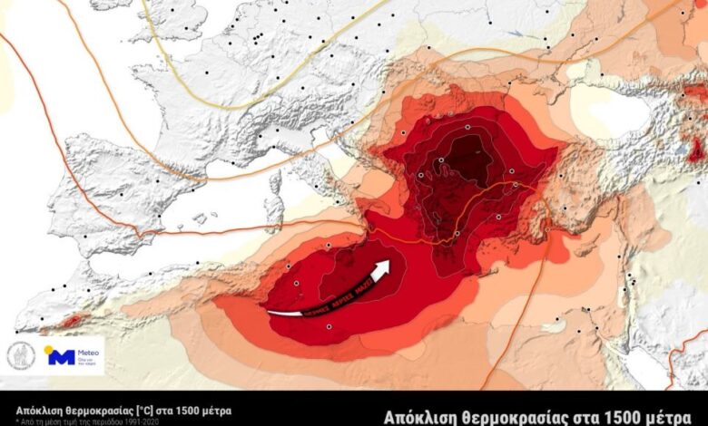 Ειδικότερα, όπως αποτυπώνεται σε χάρτη του Meteo/ Εθνικού Αστεροσκοπείου Αθηνών, η θερμοκρασία στα 1.500 μέτρα από την επιφάνεια της θάλασσας, κατά το χρονικό διάστημα από τη Δευτέρα μέχρι και την Παρασκευή στα Βαλκάνια, θα είναι έως και 10 βαθμούς υψηλότερη από τη μέση τιμή της περιόδου 1991-2020.