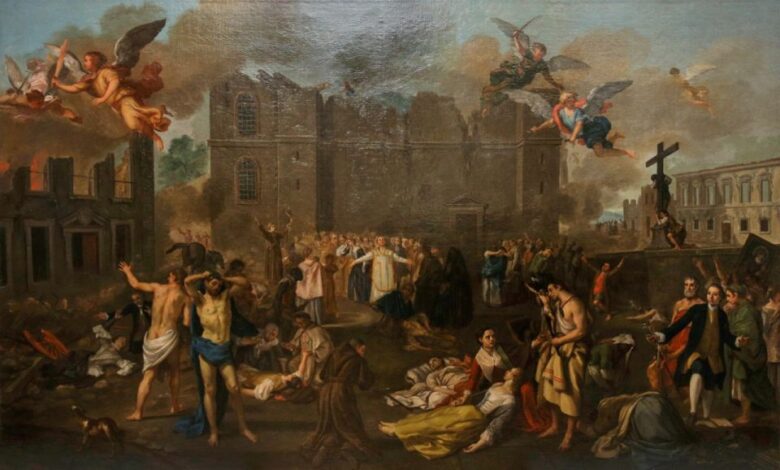 Πίνακας της περιόδου 1756-1792 από τον João Glama Ströberle, που απεικονίζει τον σεισμό του 1755 ως Θεία Δίκη (όπως υποδηλώνει η παρουσία αγγέλων με σπαθιά). Βρίσκεται στο Εθνικό Μουσείο Αρχαίας Τέχνης της Λισαβόνας