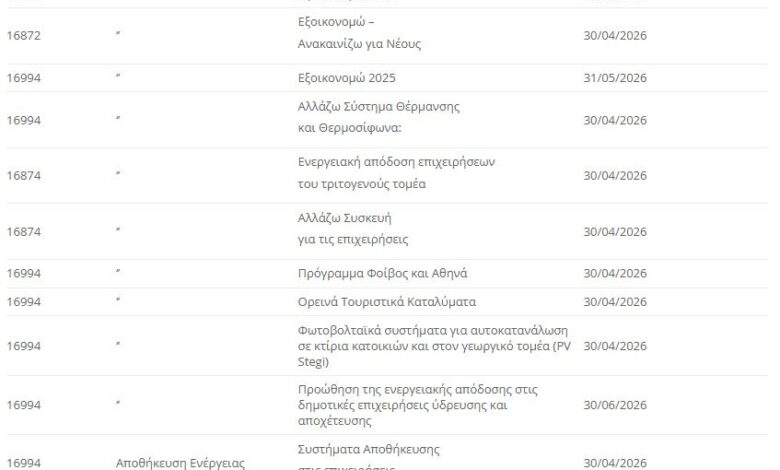 • Ενεργειακή απόδοση επιχειρήσεων του τριτογενούς τομέα: Η ολοκλήρωση του έργου, παρατείνεται έως την 30η Απριλίου 2026.