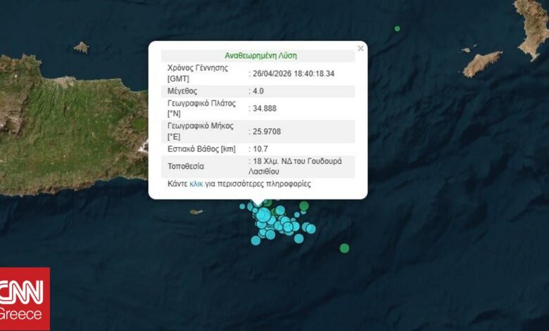 Συνεχίζεται η σεισμική δραστηριότητα στην Κρήτη, καθώς το βράδυ της Κυριακής (26/4) σημειώθηκε σεισμός μεγέθους 4 Ρίχτερ στα ανοιχτά του Λασιθίου.