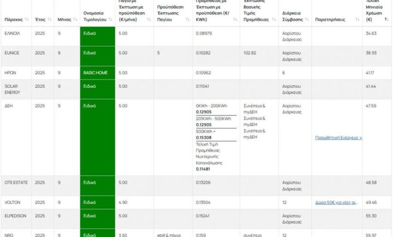 Δείτε αναλυτικά όλες τις τιμές στα πράσινα τιμολόγια: