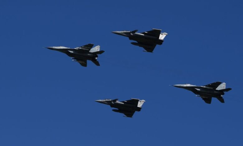 Μιγκ-29 του σερβικού στρατού και μαχητικά αεροσκάφη Rafale της γαλλικής πολεμικής αεροπορίας πετούν στον ουρανό του Βελιγραδίου κατά τη διάρκεια στρατιωτικής παρέλασης, το Σάββατο 20 Σεπτεμβρίου 2025.