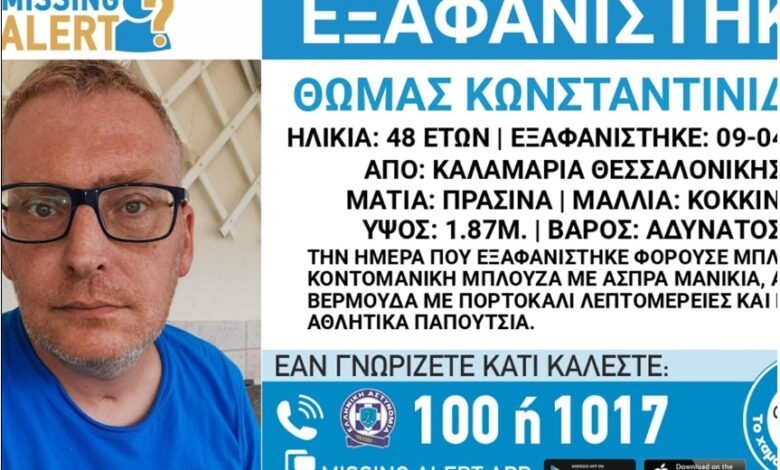 Συναγερμός έχει σημάνει στις αρχές για την εξαφάνιση ενός 48χρονου άνδρα στην Καλαμαριά Θεσσαλονίκης.