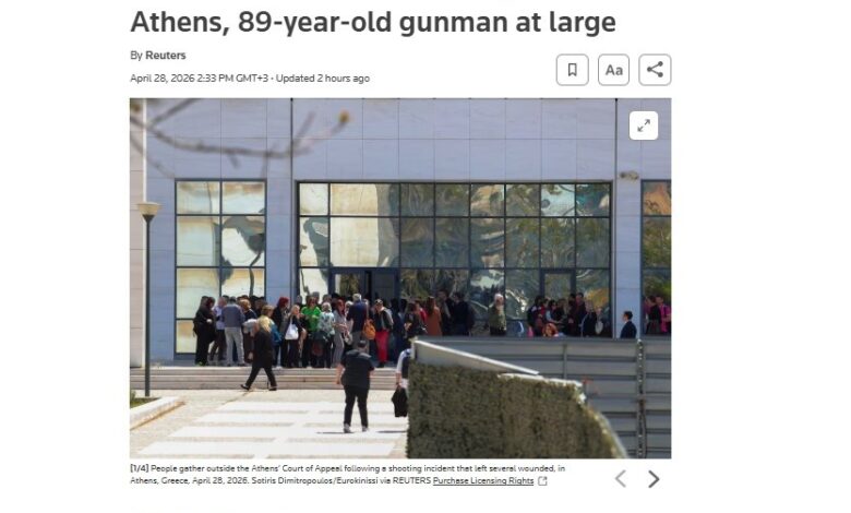«Πέντε τραυματίες σε δύο περιστατικά πυροβολισμών στην Αθήνα – Διαφεύγει της σύλληψης ο 89χρονος δράστης» αναφέρει το Reuters.