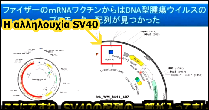 Ο δημοσιογράφος – συνομιλητής του Ιάπωνος ειδικού είπε συμπερασματικά: «στην πραγματικότητα η αλληλουχία SV40 είναι υποκινητής των ιών του καρκίνου» και ο Καθηγητής είπε: «Ναι, είναι γνωστό αυτό. Η αλληλουχία αυτή προκαλεί καρκίνο και για κάποιους λόγους είναι παρούσα στο DNA. Όπως ξέρουμε, χρησιμοποιούμε την ακολουθία αυτή, την SV40, σε μεγάλη ποικιλία πειραμάτων. Εν τούτοις η ερώτηση είναι γιατί να υπάρχει ο παράγων αυτός σε mRNA εμβόλια».