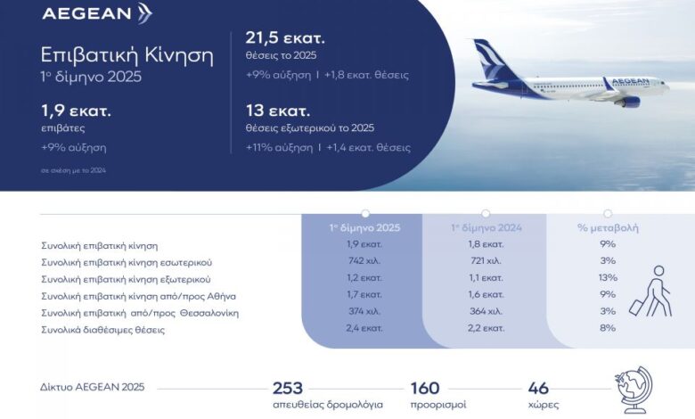 AEGEAN: Αύξηση 9% στην επιβατική κίνηση το 1ο δίμηνο του 2025 – Μετέφερε 1,9 εκατ. επιβάτες
